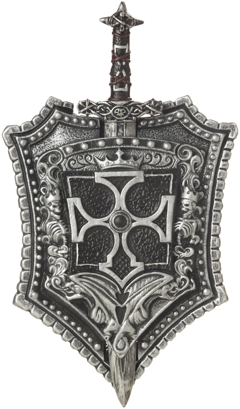 Show off your Knightly abilities with this serious sword and shield. Ready for battle, the shield features ornate knight detailing with a cross in the center and perfectly holds the knight sword which features a thin silver blade and an ornate silver handle with a star end.