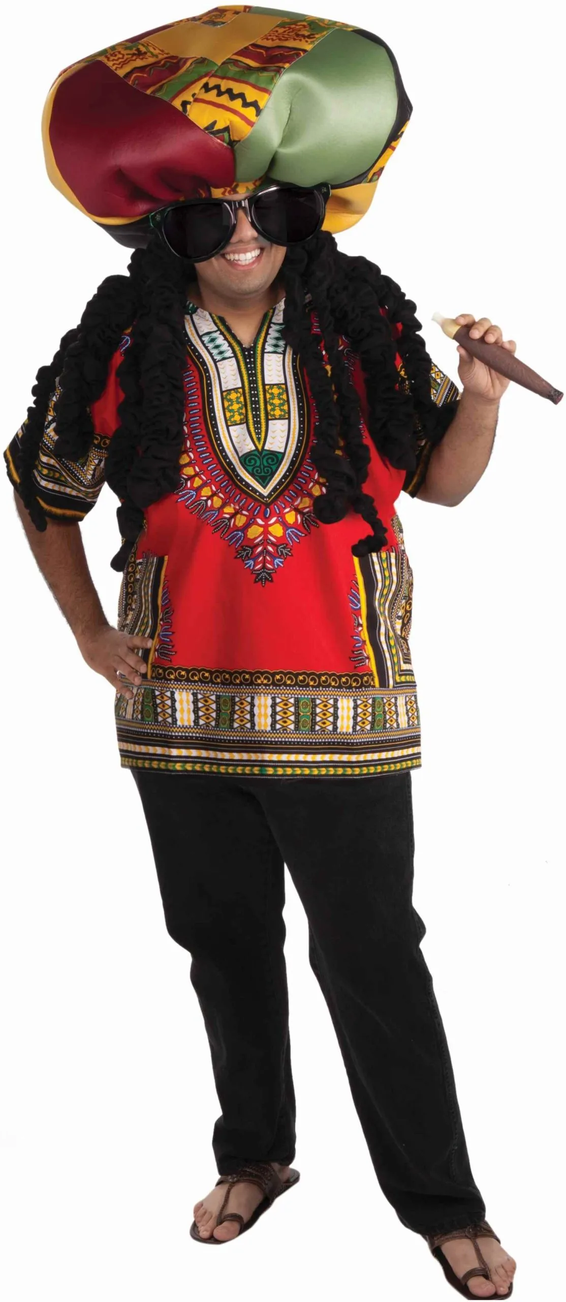 Kick back and relax with your ridiculous locks this Halloween! The Rasta Ridiculous Adult Costume includes a multi colored tunic style shirt, a pair of over sized sunglasses, and a jumbo rasta hat with attached black dreadlocks.