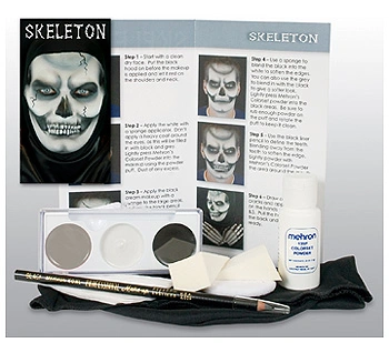Grey, White, and Black Base MakeupTwo Sponge ApplicatorsPowder PuffBlack Liner PencilColorset PowderBlack HoodTake your costume to the next level with this skeleton makeup character kit! It includes step-by-step instructions, makeup palette (black, grey and white), makeup remover cloth, full size pencil liner, colorset setting powder, full size makeup brush, non-latex foam wedge, powder puff and a black hood. An excellent way to make your Halloween costume uniquely and terrifying you!